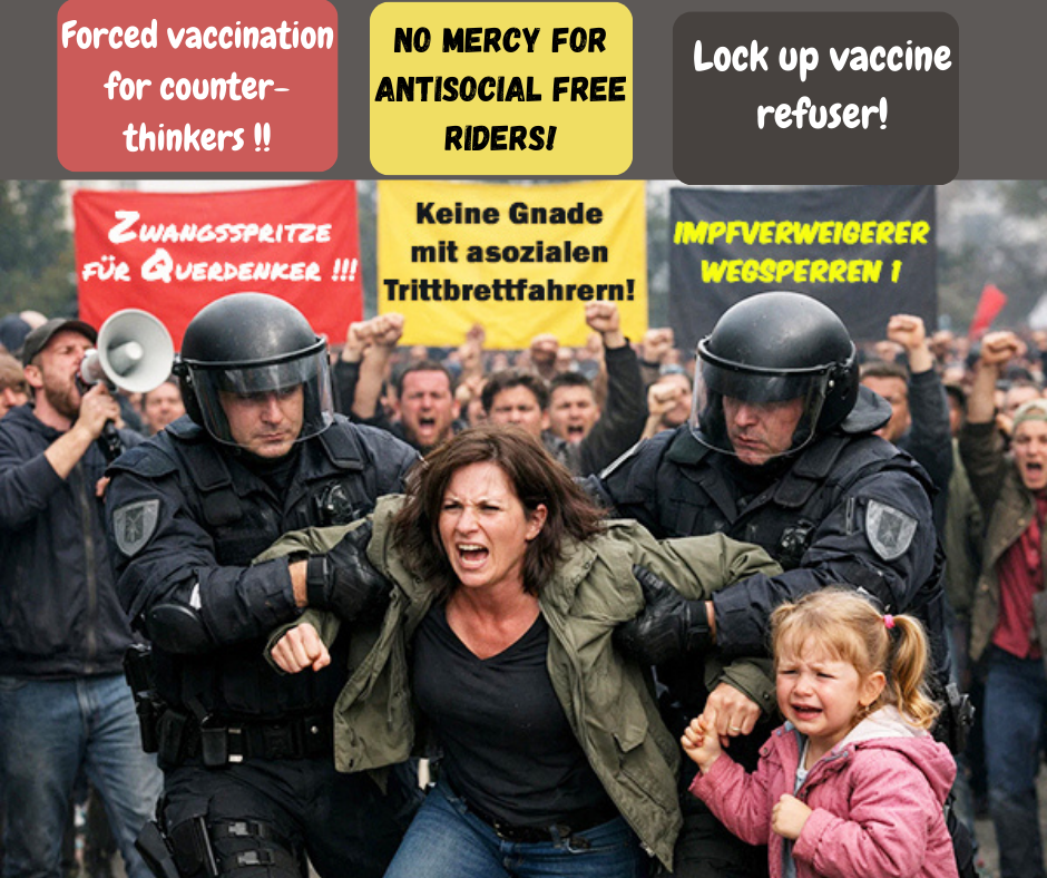 In cases of persistent refusal, legal experts such as Gunnar Duttge and Kathi Gassner considered prison sentences of up to two years conceivable, analogous to § 316 of the Criminal Code for “dangerous behavior.” In 2021, Tübingen’s Green mayor Boris Palmer advocated “coercive detention” and batons against lateral thinkers at demonstrations. (1) Saxony’s Minister of Social Affairs declared it ‘necessary’ in “individual cases” to lock up quarantine refusers in psychiatric wards – why not also unyielding vaccine refusers?